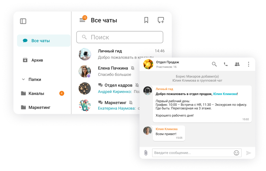 Личные и групповые чаты, статусы присутствия, удобная организация чатов в папках, защищённое хранилище файлов и многофункциональные чат-боты — в безопасной корпоративной системе.